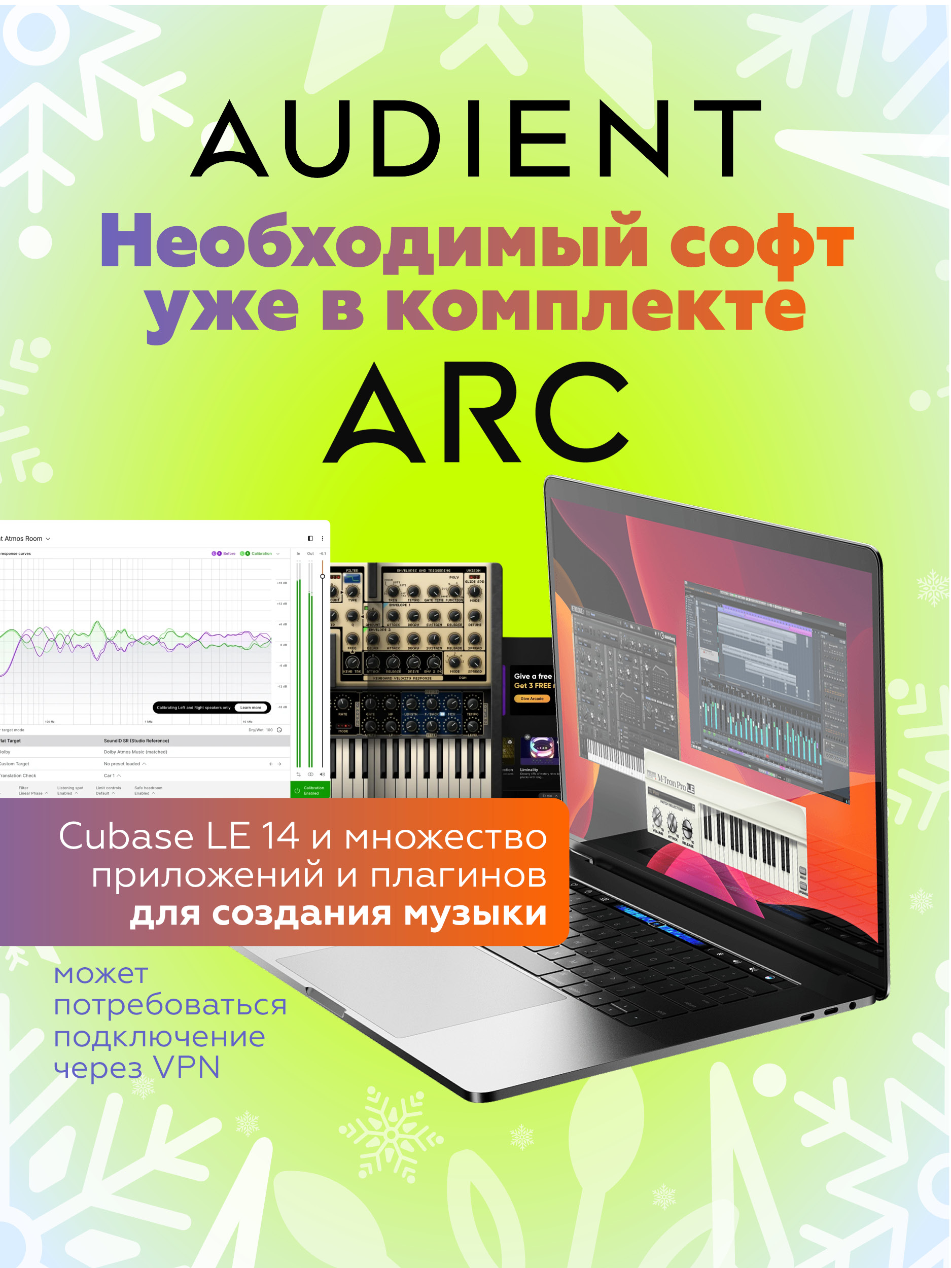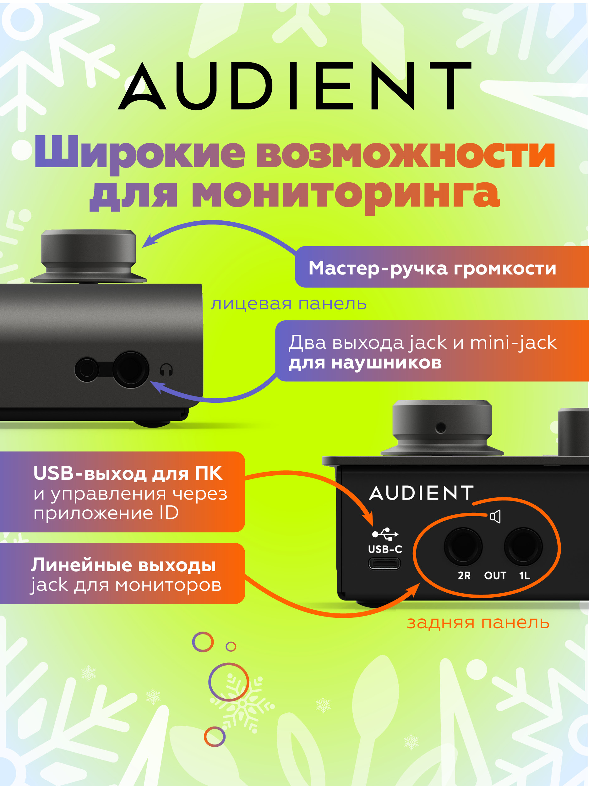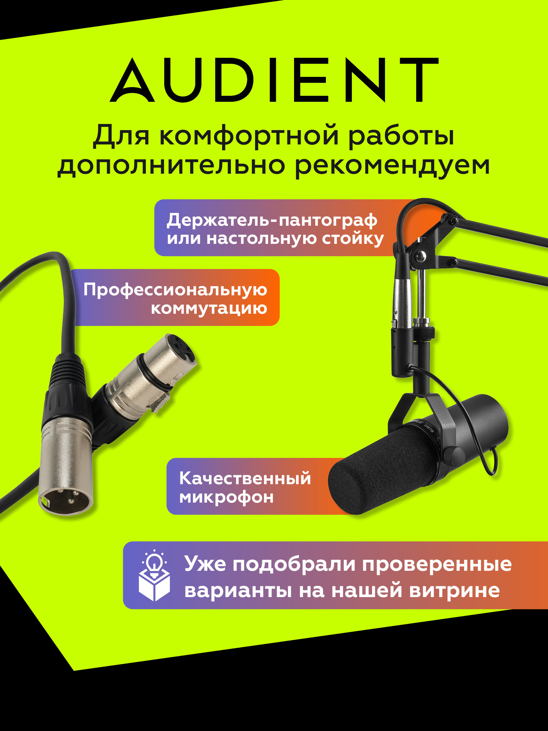 - Профессиональное качество записи — фирменный предусилитель Audient Console Mic Preamp с 58 дБ усиления.