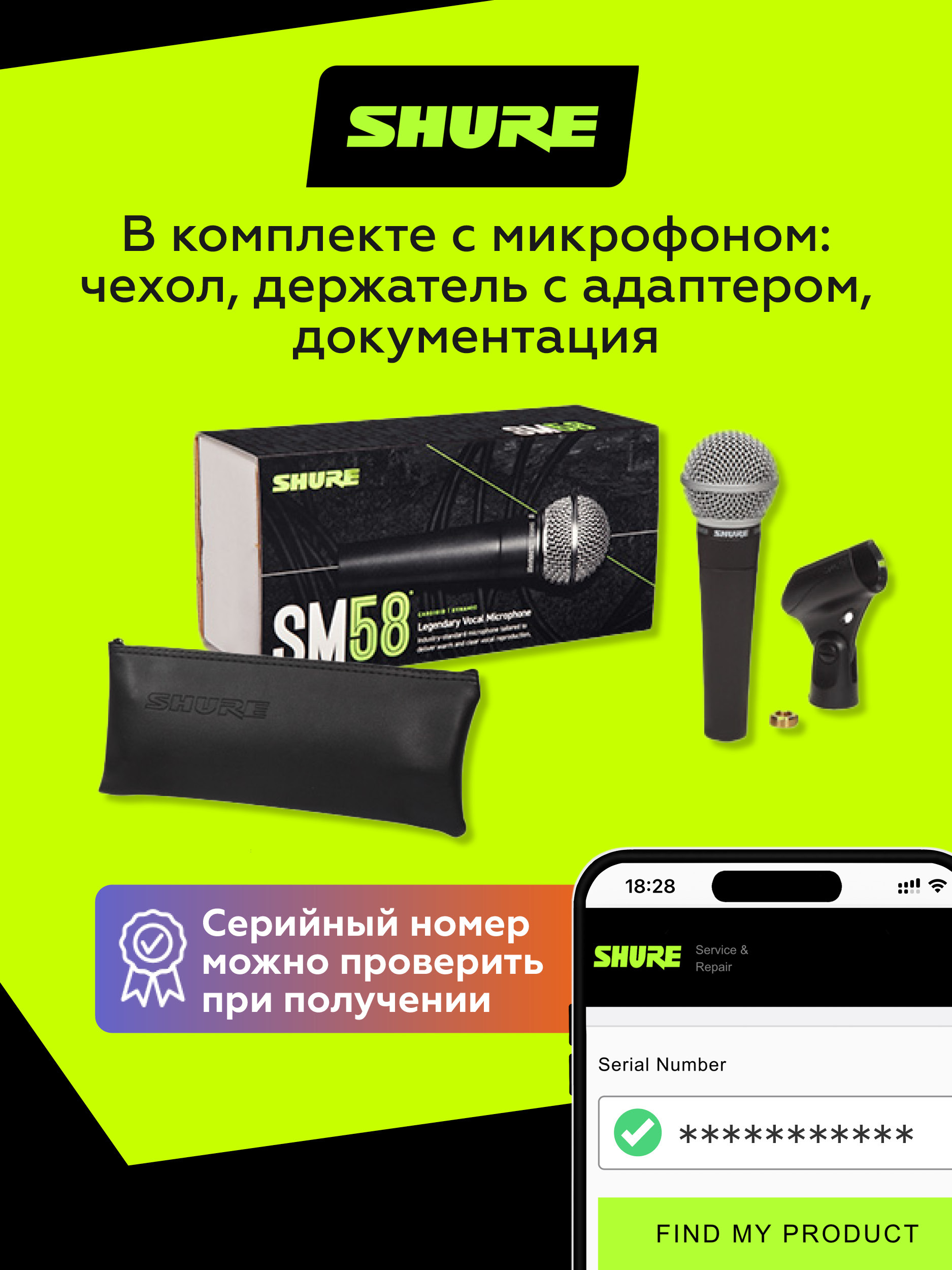 Микрофон SM58, Поворотный держатель для микрофона для микрофонной стойки A25D, чехол для хранения 26A13, документация.